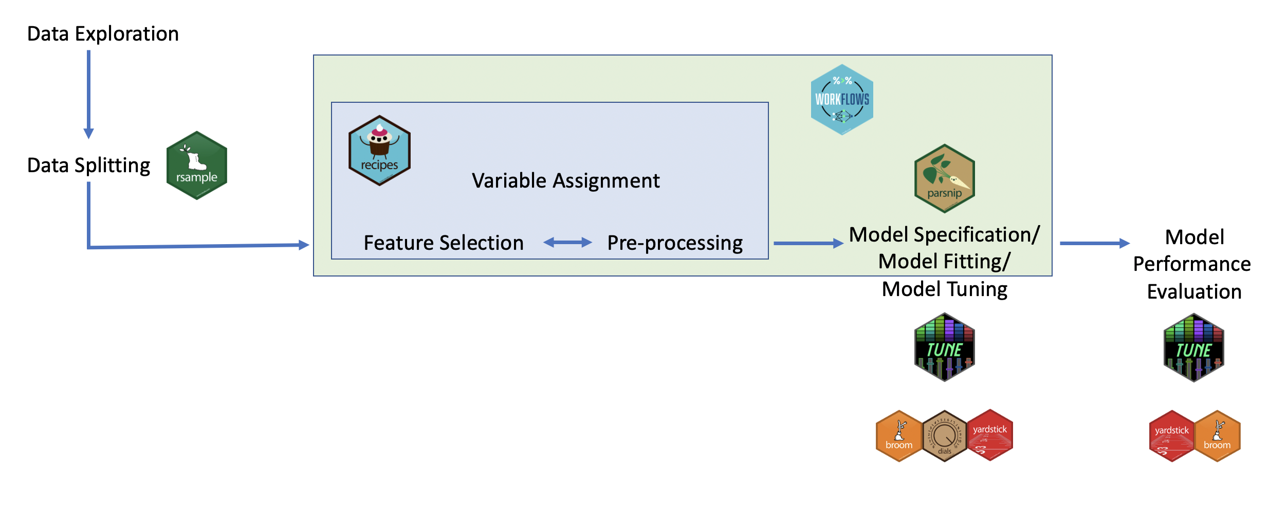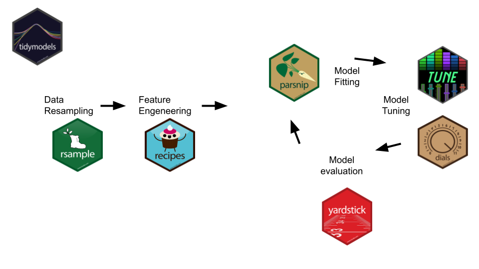 Para não deixar de valar sobre o tidymodels, explicarei, agora, a sua filosofia e como ele está dividido em outras bibliotecas que são úteis em cada parte do processo de treinamento de um modelo de machine learning.