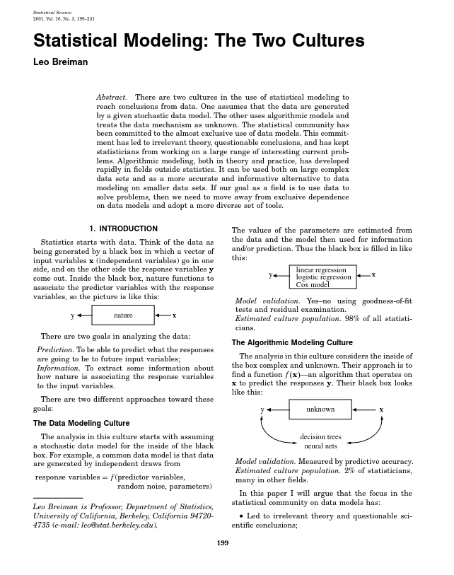 Em Breiman, L. (2001a). Statistical modeling: The two cultures. Statistical Science, 16(3), 199–231, o Leo Breiman argumenta que existe duas culturas no uso de modelos estatísticos, em especialmente na área de modelos de regressão. Segundo eles, as culturas são: