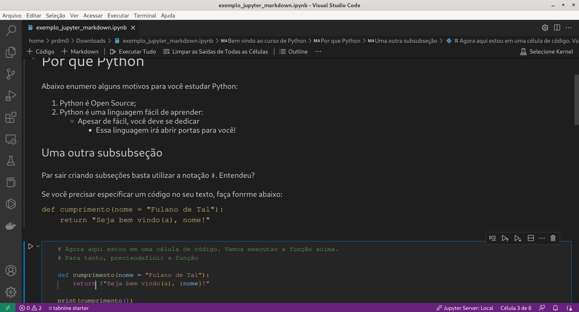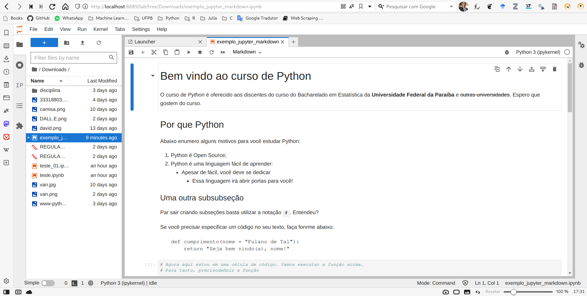 Exercício: Salve o código no arquivo exemplo_juptylab.ipynb e importe-o no JupyterLab. Você já sabe como chamar o JupyterLab! Procure entender e memorizar os comandos que foram utilizados para a formação do texto, ou seja, os comandos de Markdown utilizados.